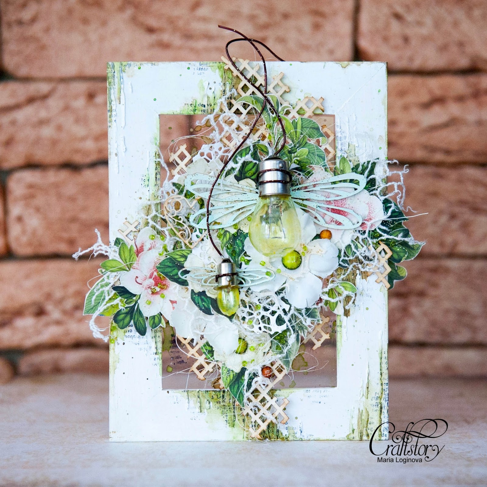 Фоновый чипборд из набора "Шебби-шик" напоминает мне ажурную решетку веранды. Особенно в сочетании со множеством вырезанных из бумаги цветов и листьев.